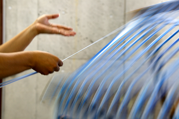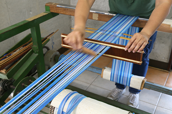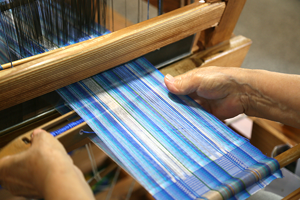 経糸(タテ糸)、緯糸(ヨコ糸)の精練の作業から染め、織りまでのすべての工程がそれぞれに熟練を要する手作業で行われ、作り手ひとりひとりのこころが込められています。